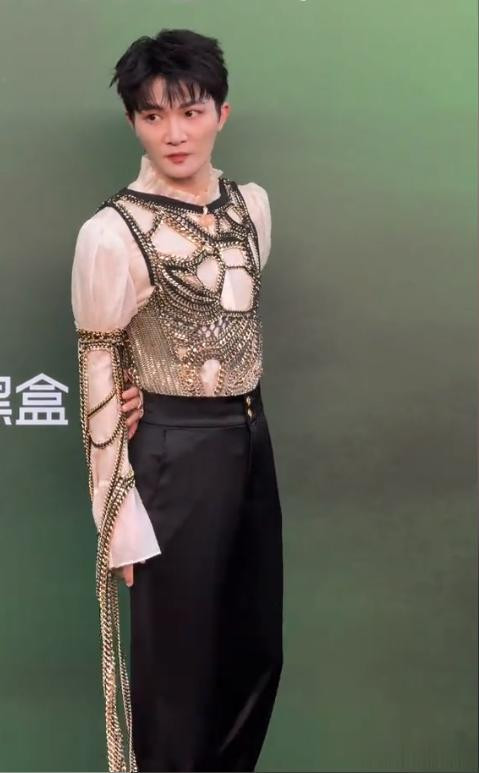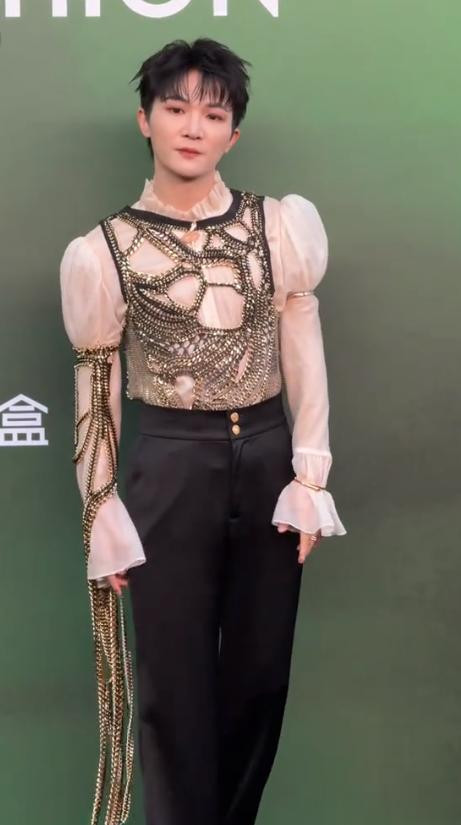 漏洞下的金银链子马甲,搭配高领透视装和黑色裤子,视觉上身高确实有所提升了。