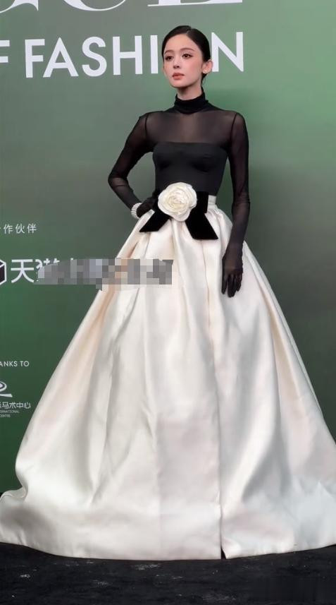 一张高级脸下,黑色透视装+白色蓬松群,再加上贴头皮的丸子头,真的很高级。
