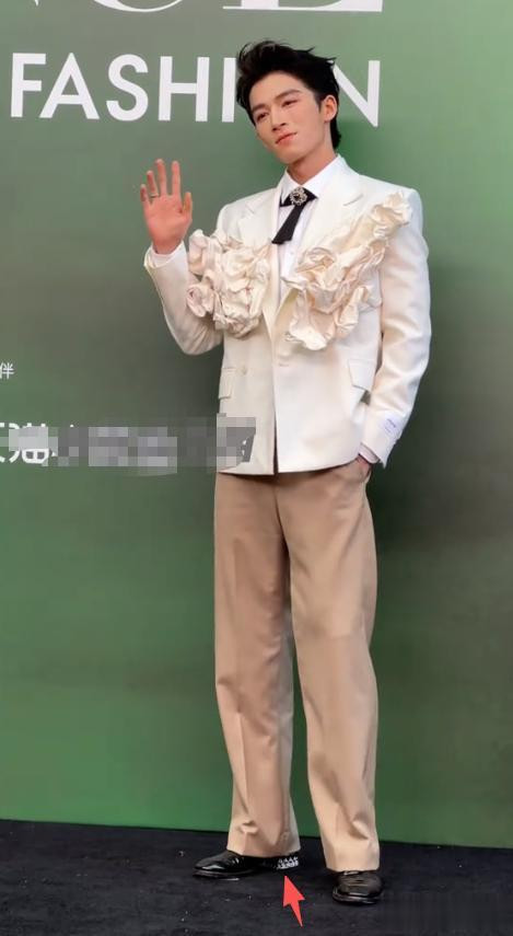 而白色西装前的两连串褶子,说像花吧,有不像,更像堆了许多卫生纸,带钻的鞋子,更亮眼。