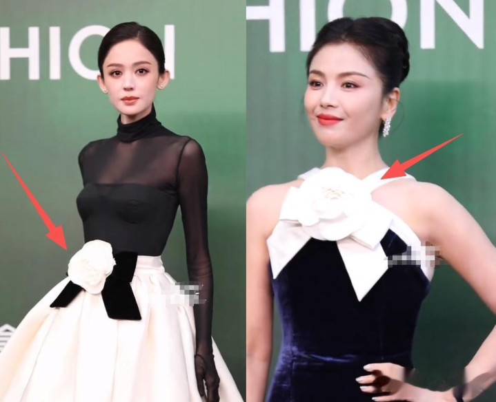 就是她腰前的白色花朵,跟刘涛脖子上的花朵撞了,都是白色、还都是圆形。