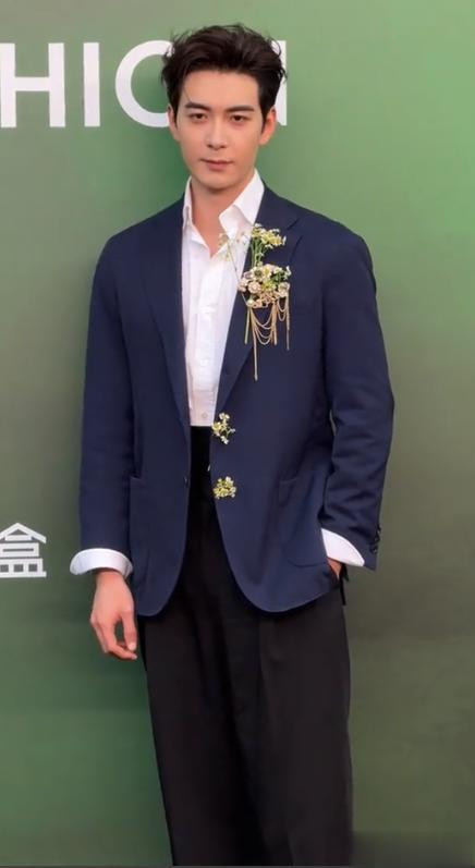陈星旭的蓝色西装,搭配了一个花束的胸针,再加上他冷酷的表情,有一种温柔霸道总裁范,挺帅的。