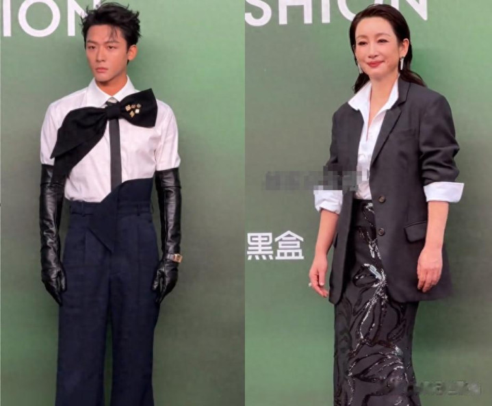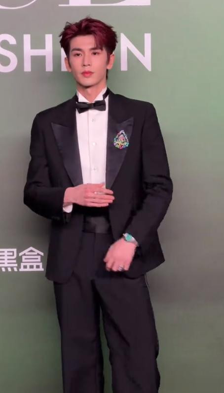 张凌赫穿着简易的黑色西装,搭配水滴的胸针,造型一般般。